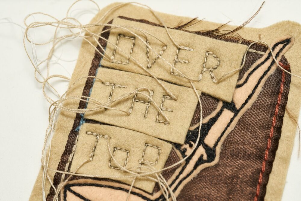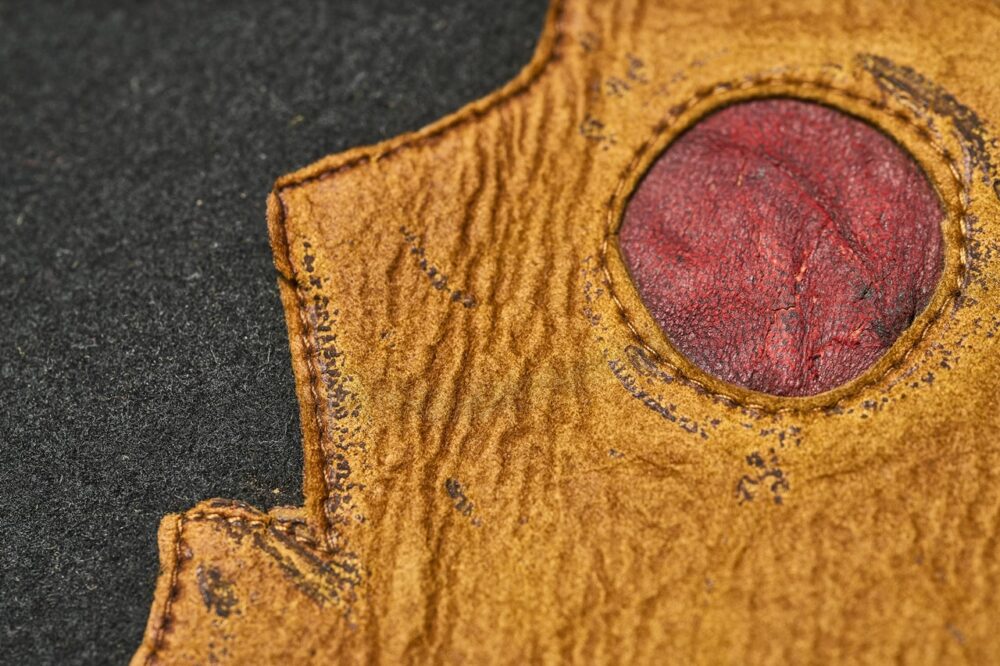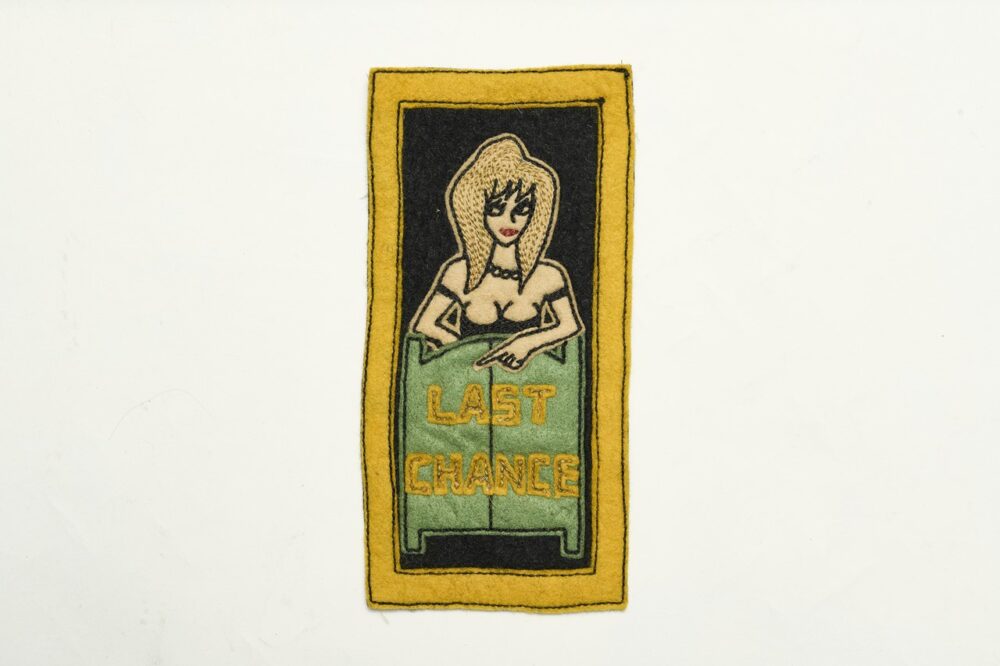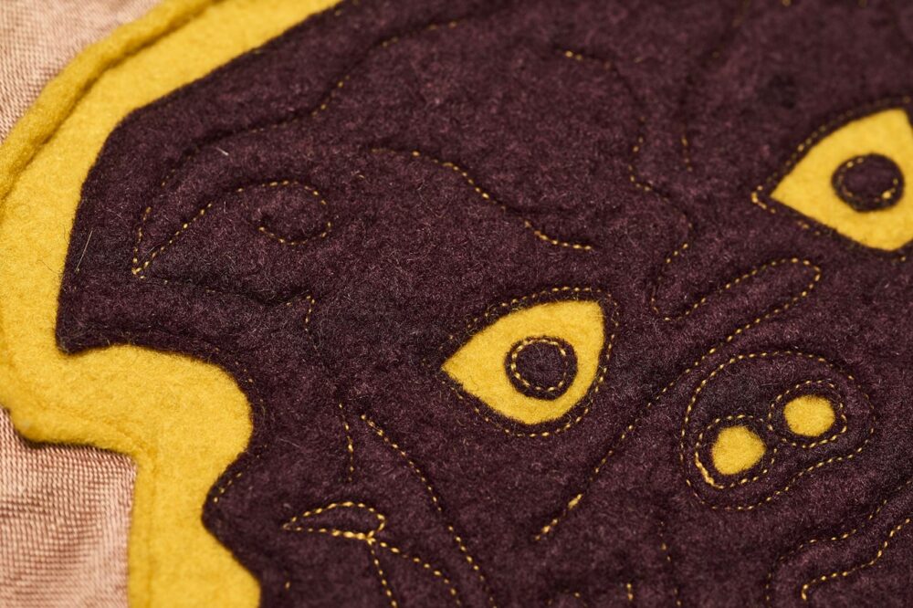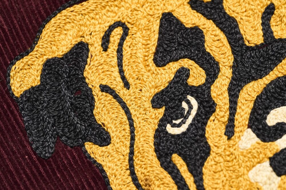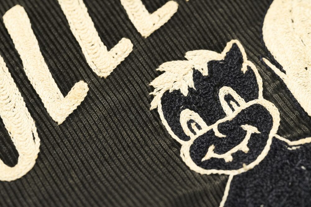 黒豹パッチはフェルト地に刺繍ミシンによるステッチワークが施されたもの。レターはチェーン刺繍。