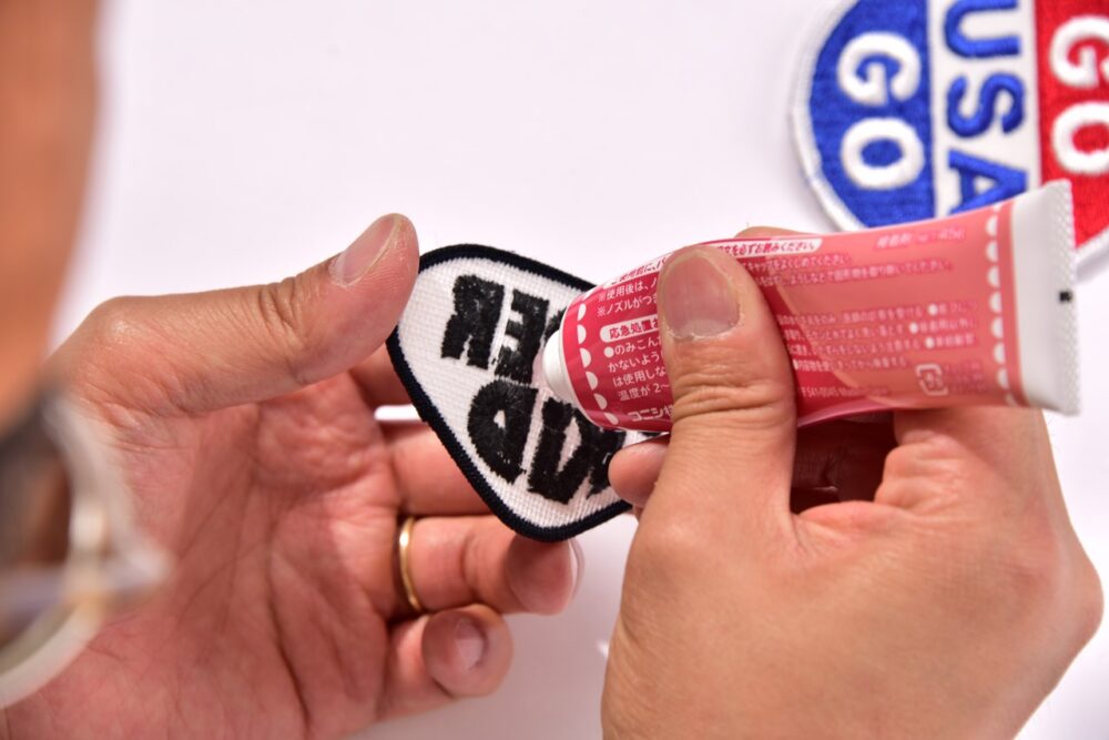 まず中央に付けるワッペンの裏に裁ほう上手を塗付する。付けすぎ厳禁だ。