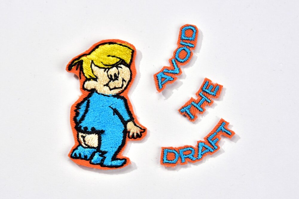 ワッペンをどう配置していくか、イメージを膨らませるためにテープで留めてみて想像を膨らませる。