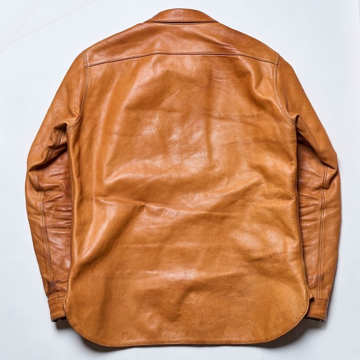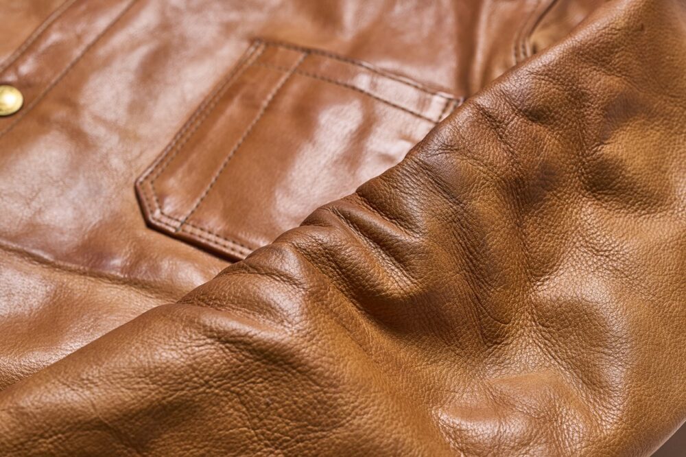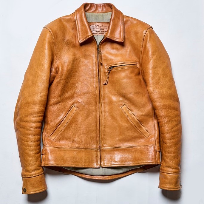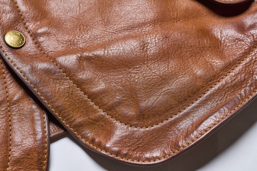 渡さんは2019年ジャケット部門の優勝者。キップレザーのジャケットはファイナリストの中で唯一だ。普段、青果店で荷物を運ぶため、腹部分の擦れがいい具合に仕上がっている。