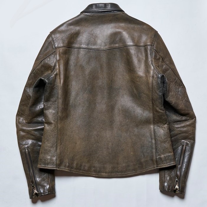 一見グリーンに見えるが、元はなんとブラック。全体が擦れて色が落ち、唯一無二の存在感を醸し出している。着用期間は約8年。学校の先生で職場でも革ジャンを着ているとか。