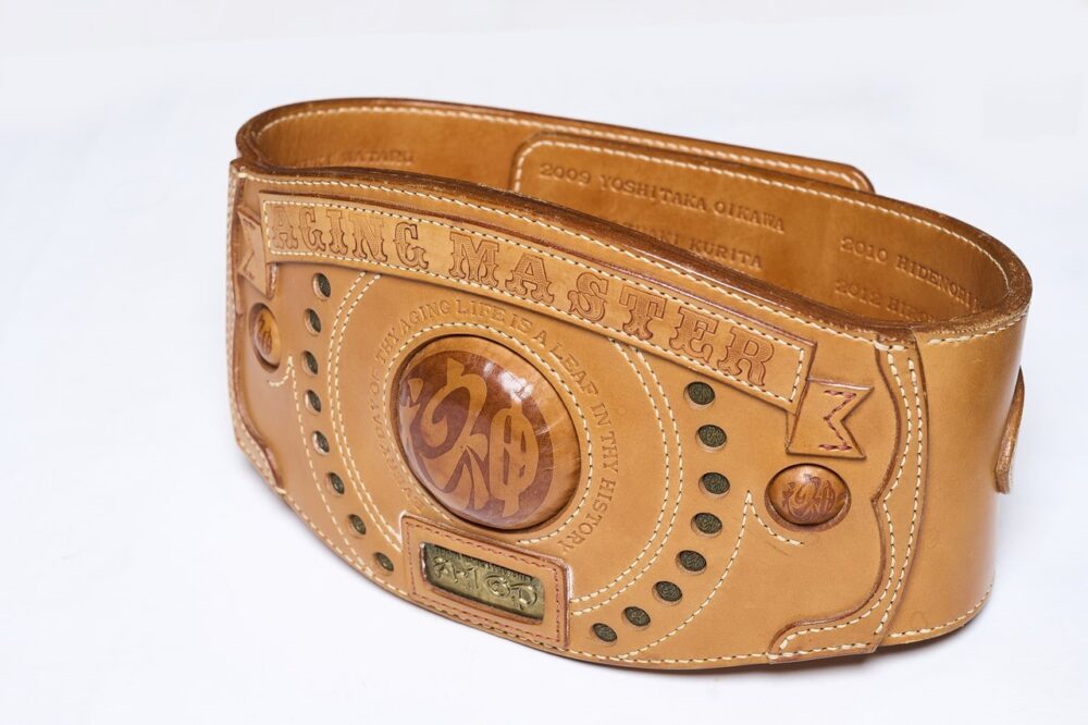 優勝者に贈られる「レザーチャンピオンベルト」。裏側には、歴代のエイジングマスターの名が刻まれる。次に名が刻まれるのは誰だ?