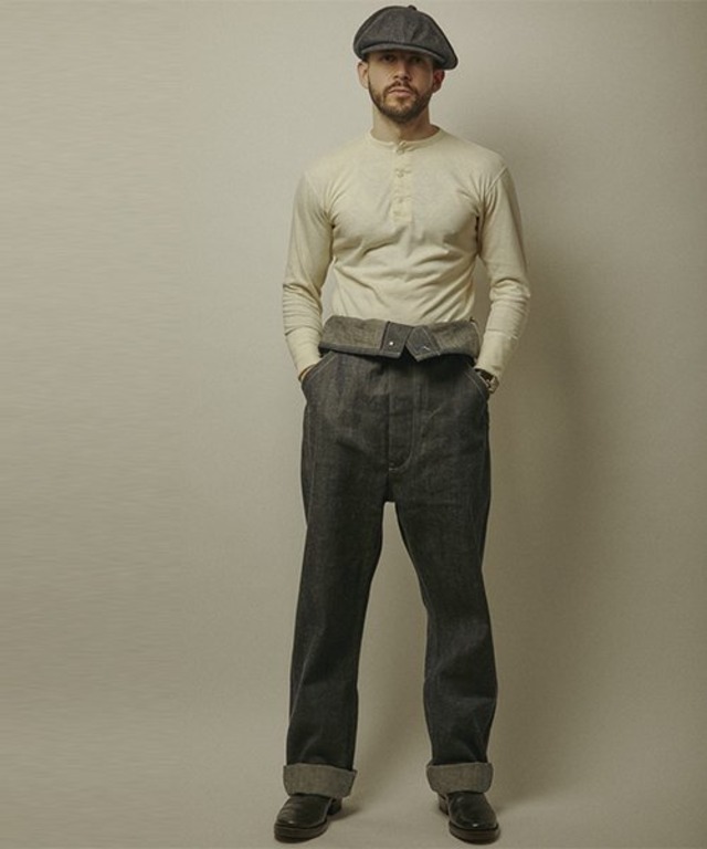 ヴィンテージのワークウエアやスポーツウエアにインスパイアされた骨太なアイテムを多数リリースするベラフォンテ。今回販売されるアイテムのなかでもとくに気になったのがチョッパーカバーオールなるトラウザーズ。これはオールインワンの上半身をカットオフしたようなデザインが特徴で、ありそうでなかったスタイルになっているのがおもしろい。穿き込むことで生まれるデニムの経年変化も楽しみ。腰上部分を折り返して穿くというスタイルは、一般的なデニムパンツとは違う新たなスタイルを感じさせるデザインだ。