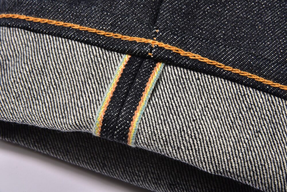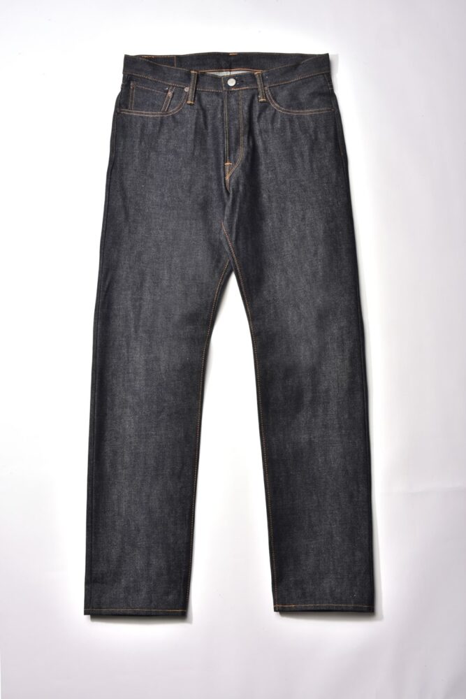 旧式のシャトル織機で織り上げた日本綿布の14.6oz セルビッジデニムを使用。ヴィンテージライクな表情と、洗練された現代的なシルエットを併せもつ。リジッド仕上げだが、防縮・防ねじれ加工を施してあるので、洗濯後もシルエットが崩れることがない。