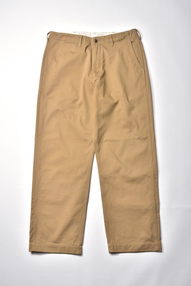 厚手のオーガニックコットン100%のチノ素材を使用したトラウザーパンツ。40 年代のミリタリーチノをベースにしたワイドフィットのシルエットは合わせるアイテムを選ばない。糊の効いたままのリジッド仕上げで、穿き込むほどに経年変化が楽しめる。