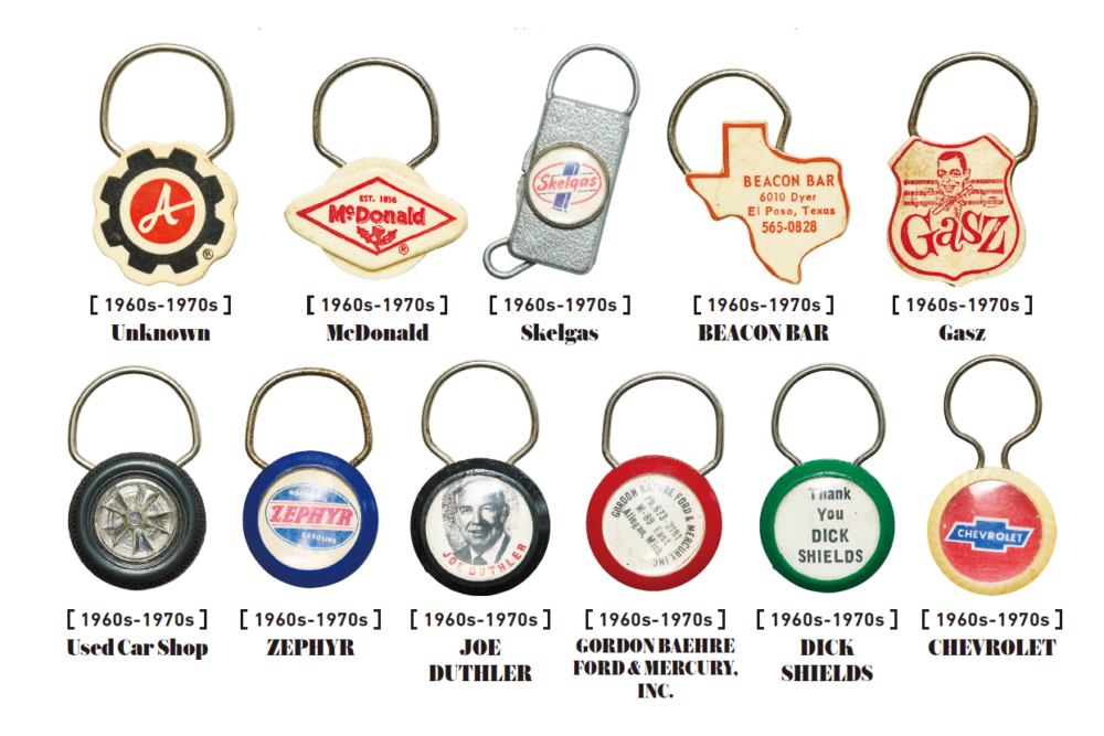 様々なジャンルのメーカーからリリースされていたノベルティのキーホルダー。凝ったメーカーはプレート部分の形を変えている。