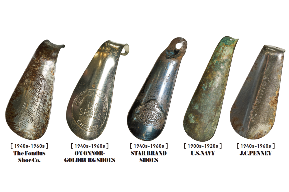 今でもシューズショップやメーカーでは定番のノベルティであるシューホーン。ただ1960年代以降になるとプラスチック製がメインに。スチール製が多いが、さらに旧いものだとブラス製の個体も散見できる。
