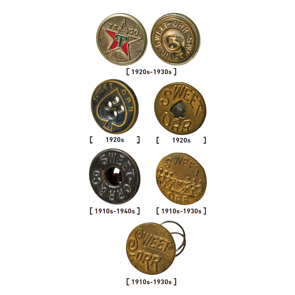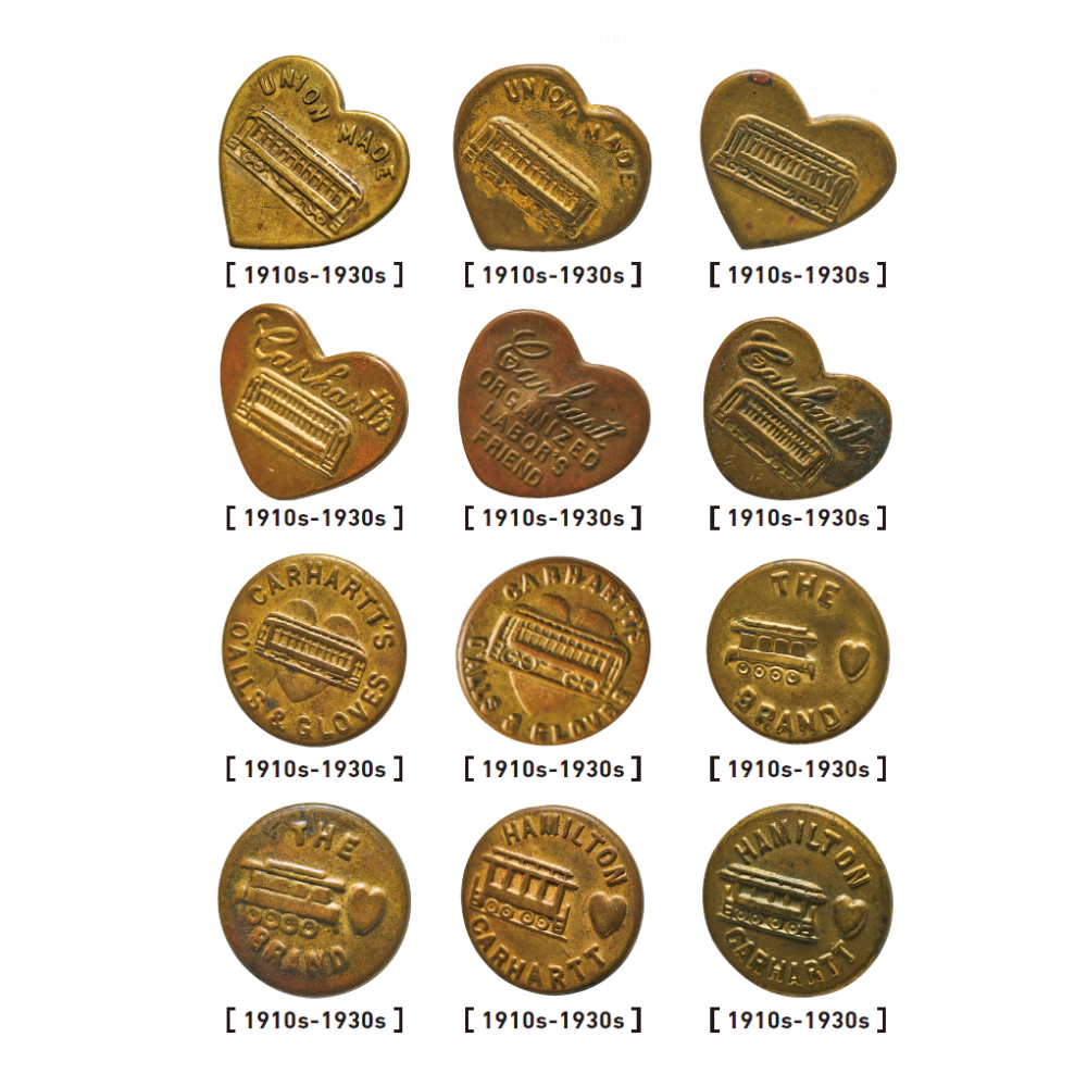 多くのワークウエアが自社製品だとひと目でわかるようにロゴの入ったボタンをこぞって採用していた。特にカーハートはバリエーションが多く、ハート型のボタンは人気。これらはすべてチェンジボタンである。