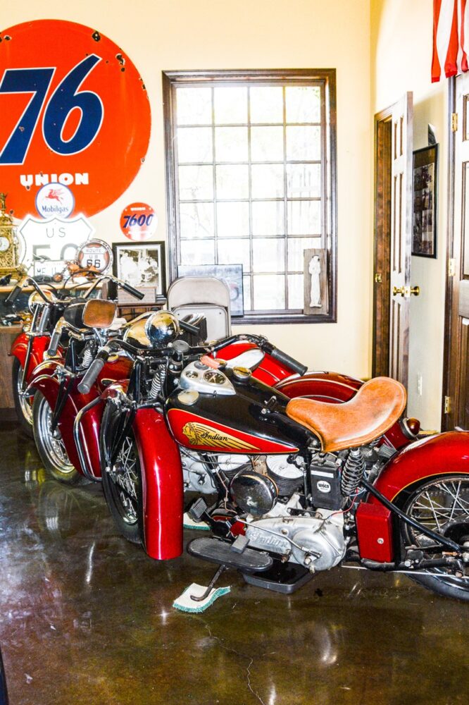 クルマだけでなくモーターサイクルも大好物。写真に写っているインディアンは1940年式スカウト、1941年式スカウト、1948年式チーフなど。そのほかにもここには写っていないけれど、1960年式ハーレーのパンヘッドも所有している。
