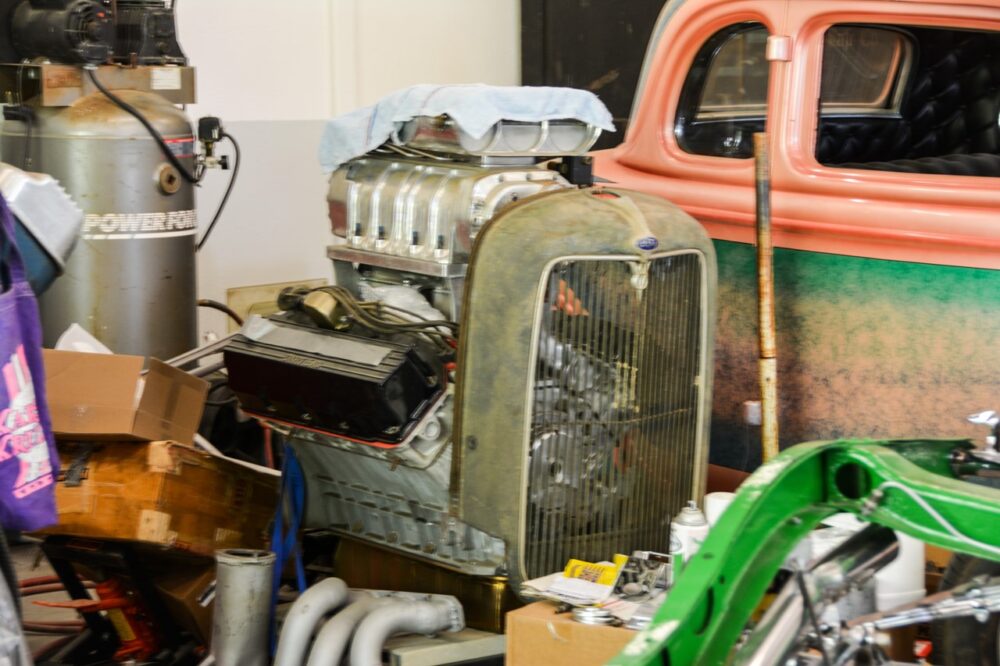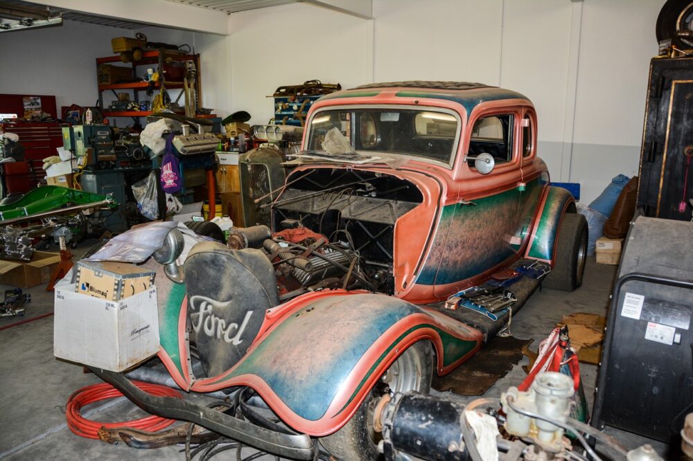 ビルド中の’34年式フォード。数台のクルマを同時並行で作業しているというから、もはやプロのメカニック級。