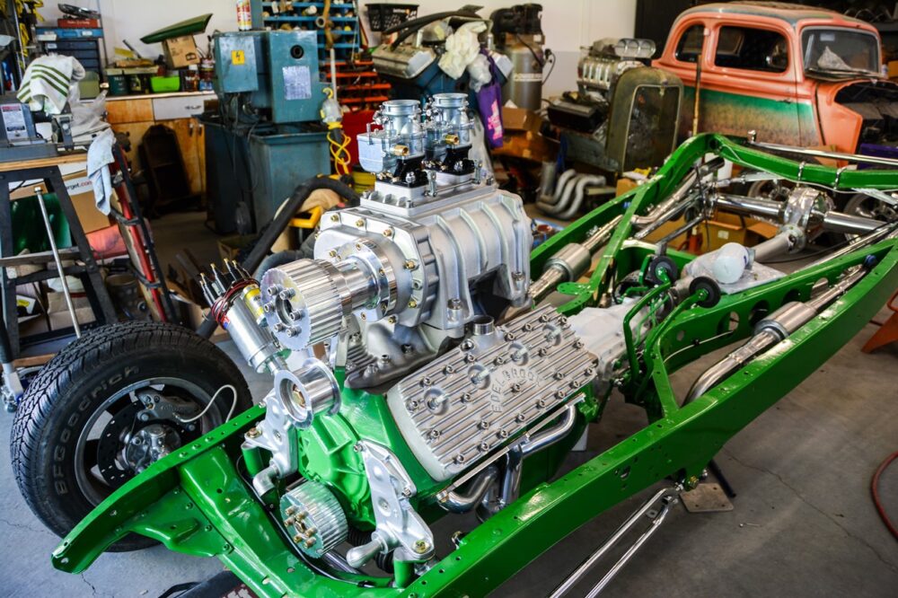 ビルド中のマシンはまだフレームにエンジンが載っただけ。フラットヘッドV8にスーパーチャージャーを搭載している。