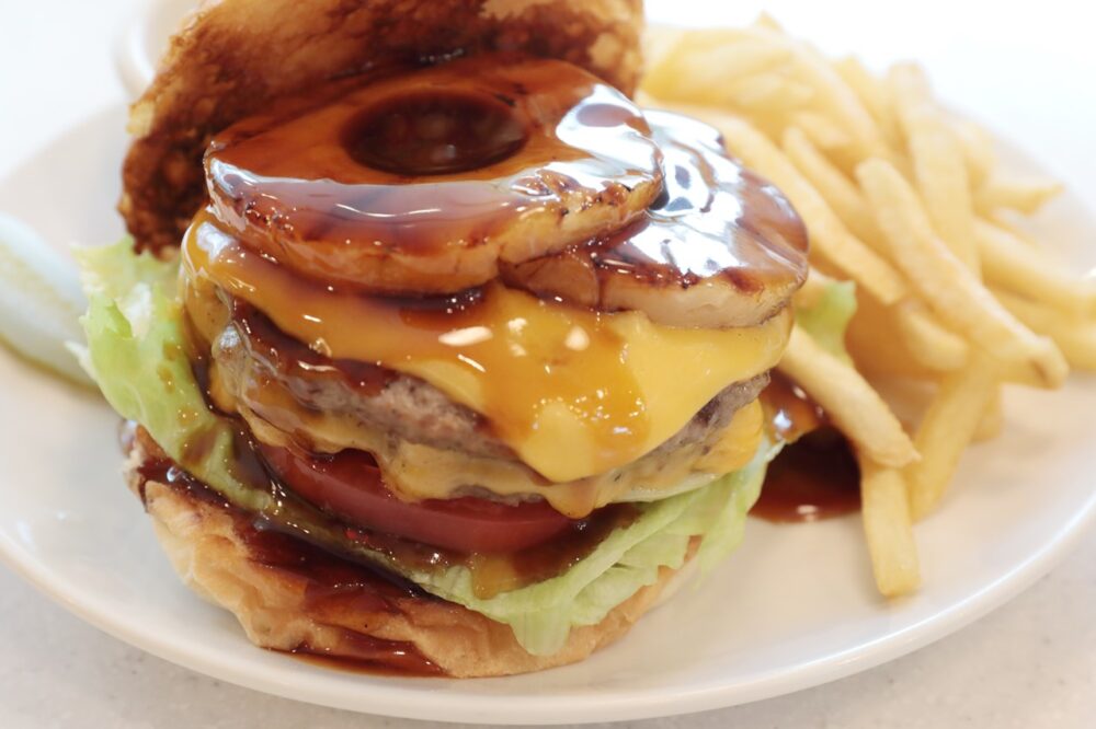 ディーンムーンバーガーは112.5gのパティをダブルで包むボリューミーなハンバーガー。写真はBBQソース、パイナップル、ベーコンをトッピング。3100円