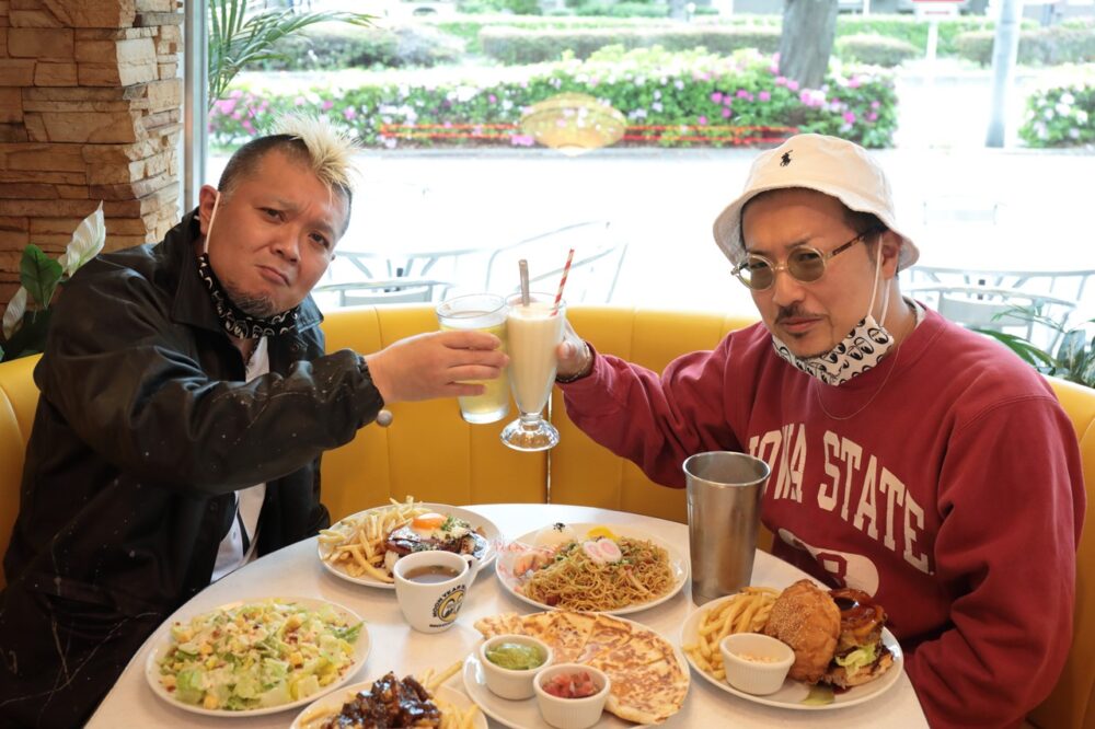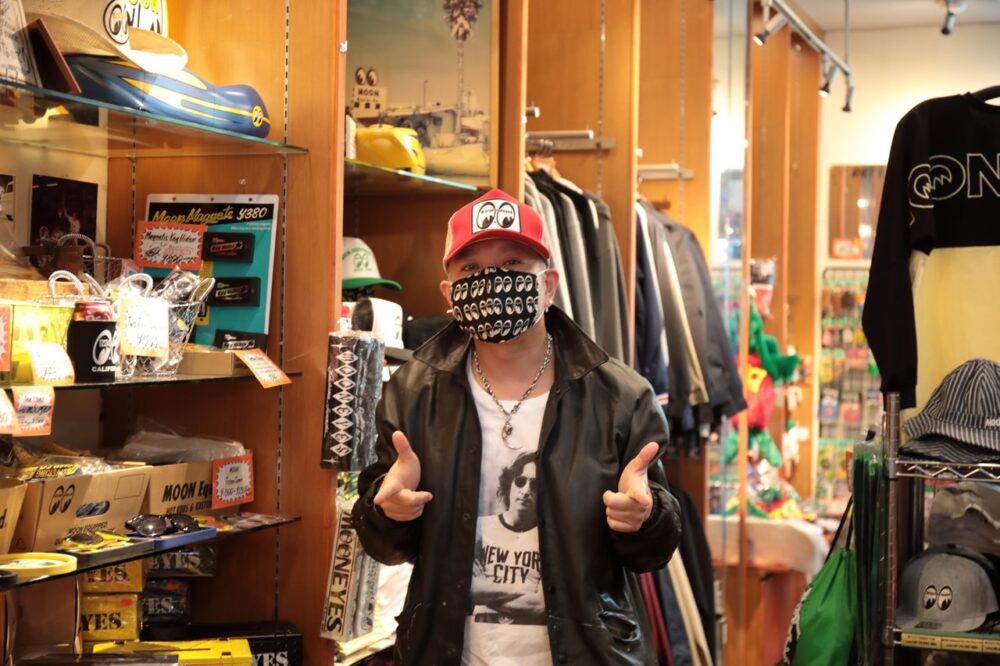 取材に訪れてすぐ、モヒカン小川、ランボルギーニ三浦揃ってMOON Equippedロゴの総柄マスクを購入。コロナ禍期間中は外出時の必須アイテムだけにマスクのデザインにもこだわりたい。