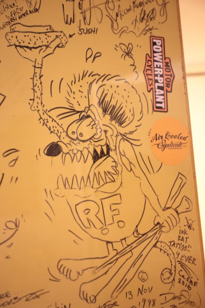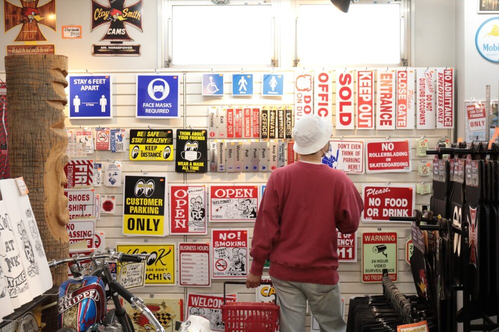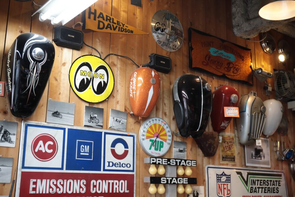 店内にある旧い本牧の写真や海外ゲストの直筆サインにも注目。ビッグネームの数々にムーンアイズが日本のカスタムカルチャーに与えた影響力の大きさを見る。