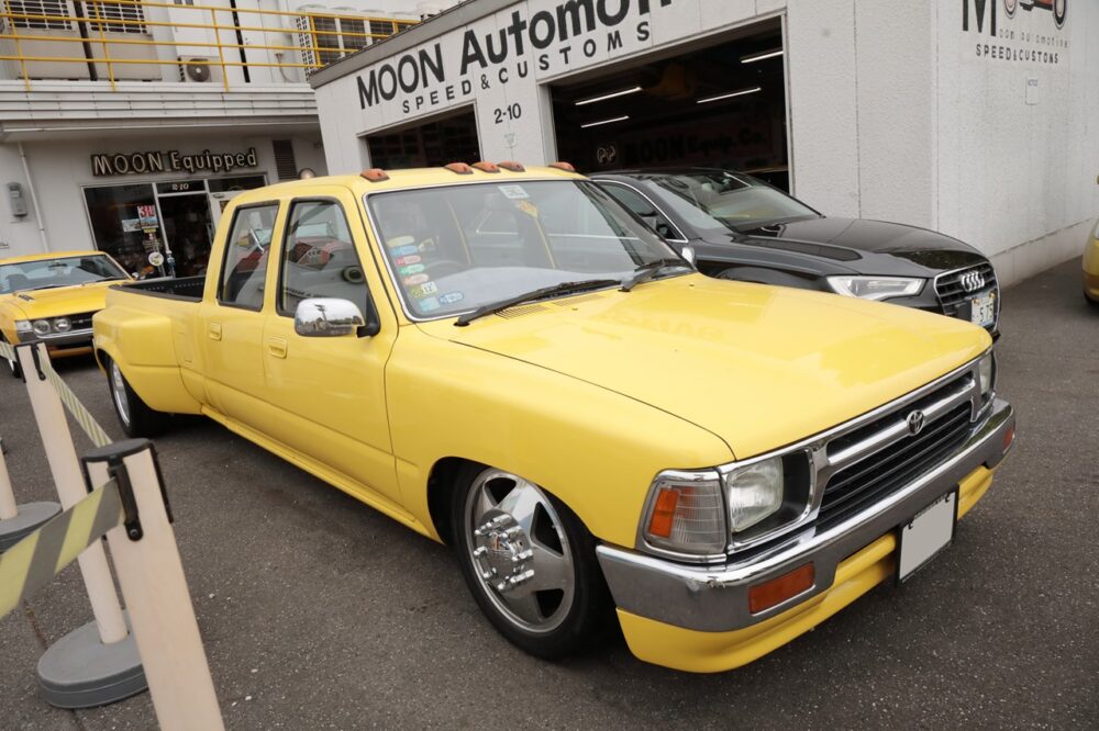’90年代にムーンアイズがプロデュースしたToyotaHi-Lux Dually。ロー&ロングのシルエットが特徴で、バイクを積むトランスポーターに最適。
