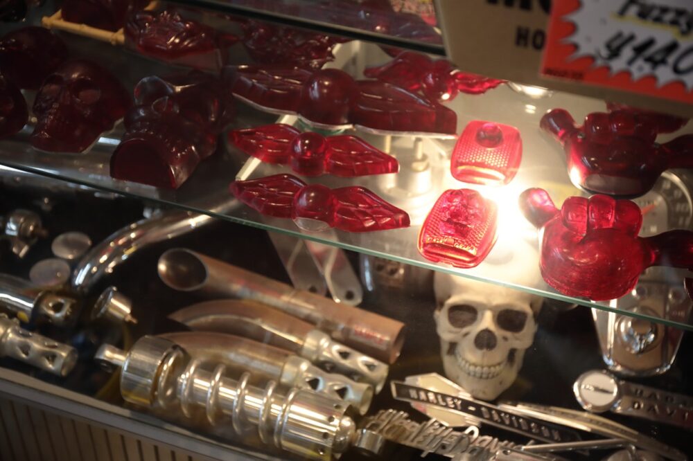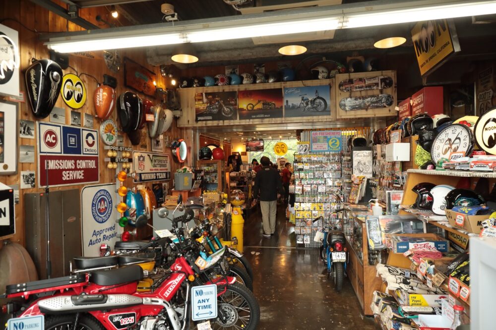 エントランスから入るとまず飛び込んでくるのはクラシカルなガレージのような雰囲気のモーターサイクルエリア。国産からH-D、英車などにも使えるカスタムパーツがずらりと並ぶ。
