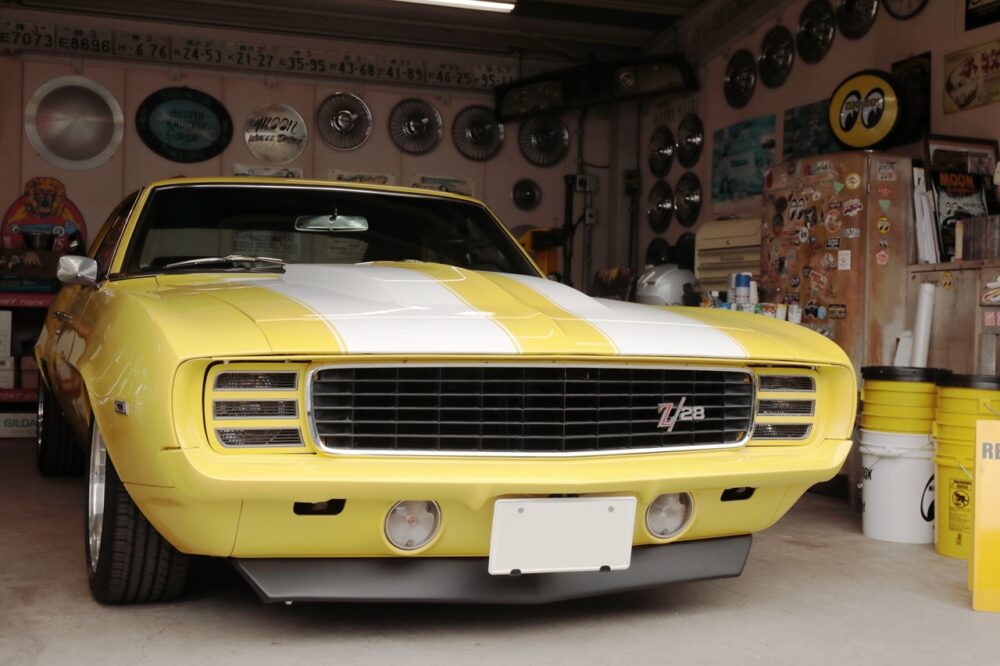 ガレージに鎮座するムーンアイズ代表、Shige菅沼さんの愛機’69年式シボレー・カマロ Z28はドラッグレースにも参戦していたホットな1台。