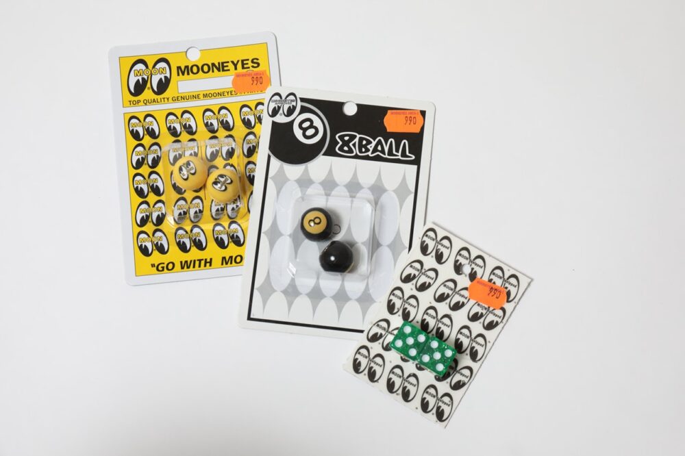 足回りのアクセントになるエアバルブキャップ。アイシェイプや8ボール、ダイスなどポップなデザインが人気だ。