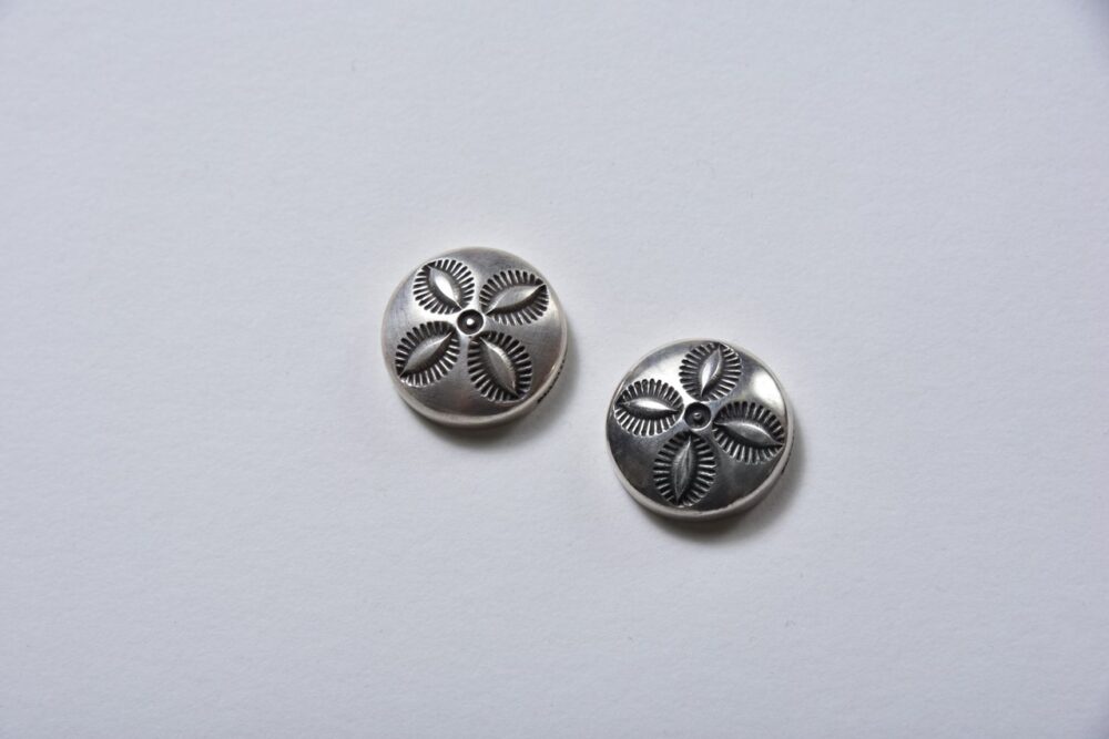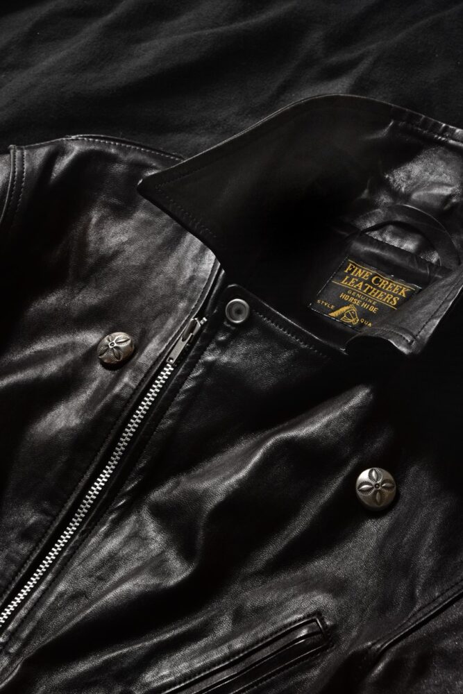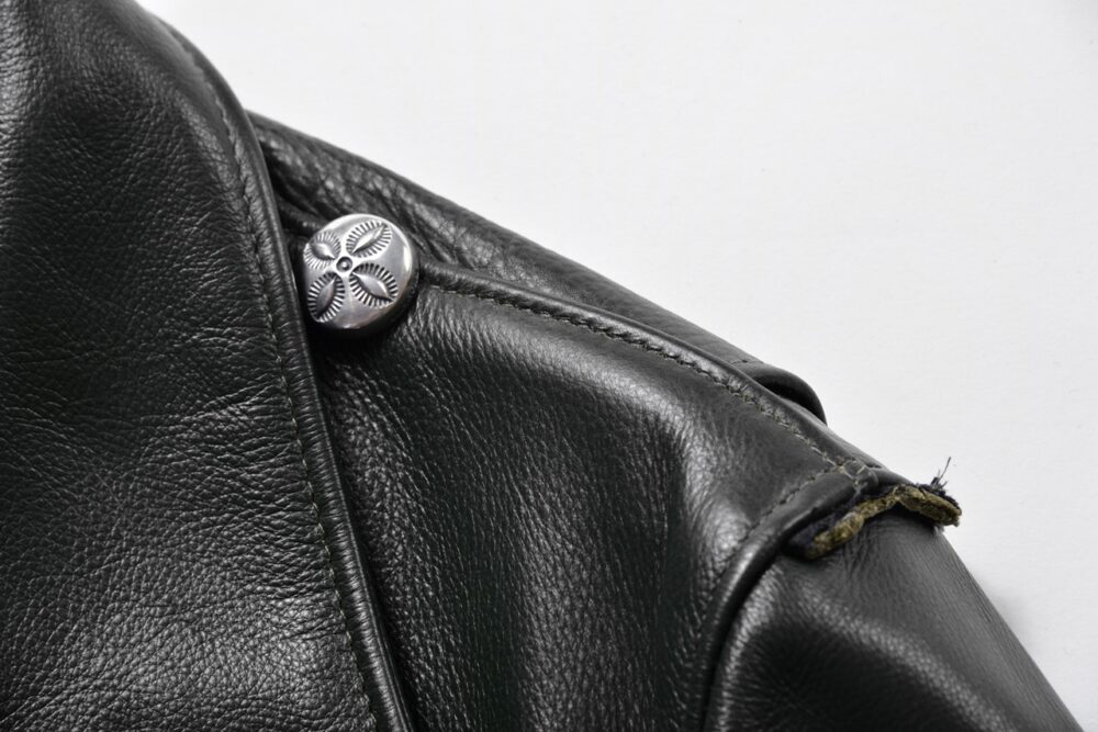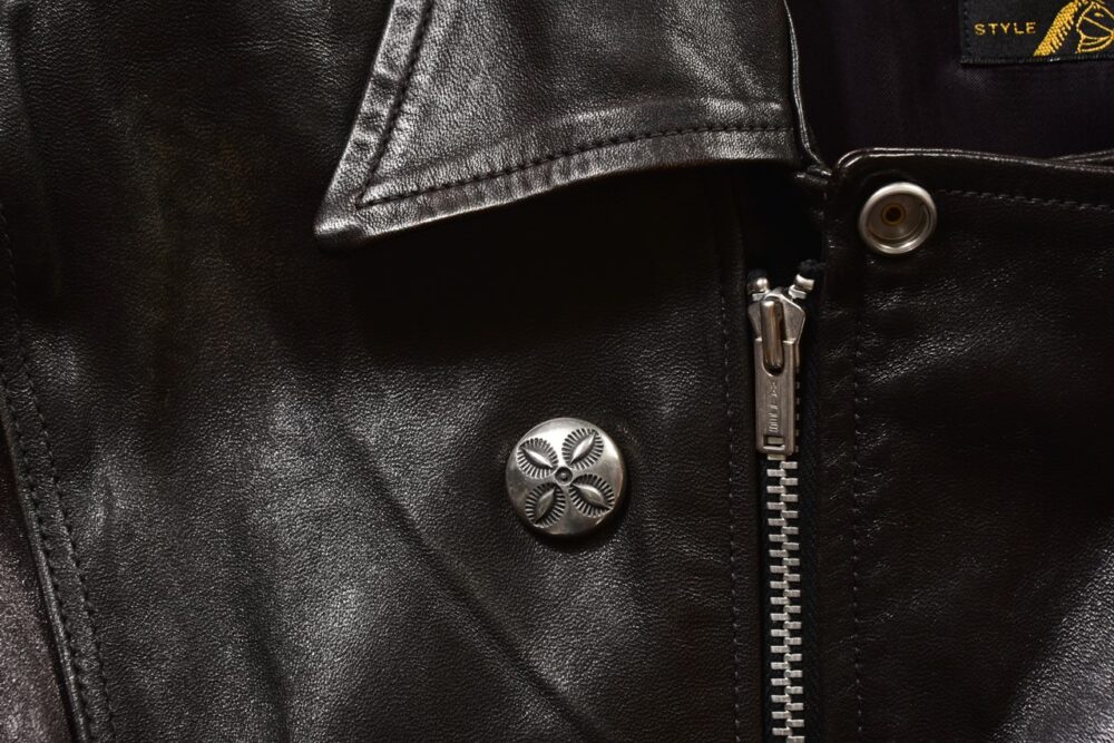 で、今回紹介するMASAYOSHIのシルバー製MKボタンも、俺にとっては仕事人に通じる「粋」なアイテム。スナップボタンに取り付けることができるので、使い方は自由自在だが、俺の場合は、ダブルライダースのスナップボタンに取り付けている。ぱっと見、シルバーだとは気づかないが、よく見ると、渋いシルバーボタンが……このさりげないお洒落、これを「粋」と呼ばずに、なんと言おうか。
