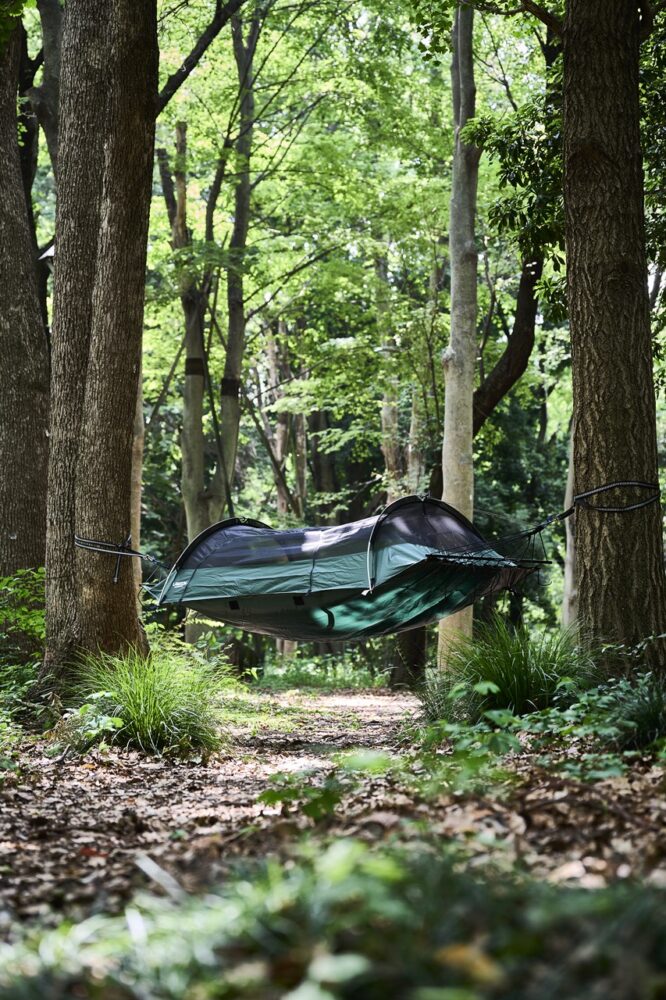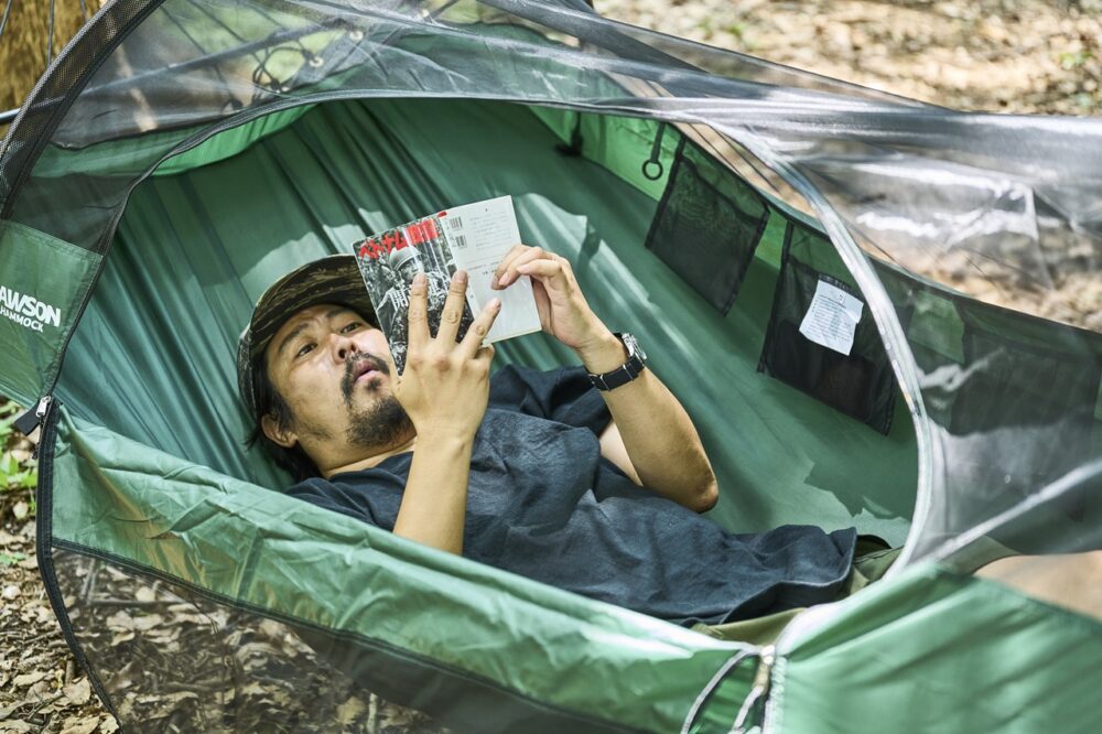 で、実際に使ってみると、これまたとてもいい感じ。普通のハンモックだと身体を包み込むようなバナナ型のデザインがちょっと窮屈に感じていたが、こいつはフルフラット設計なので、手軽に寝返りができちゃうし、寝転がる大勢を選ばない。だから近いうちに、こいつと好きな本を持って地元小淵沢の森に向かって、のんびりと自分だけの時間を過ごしたい。