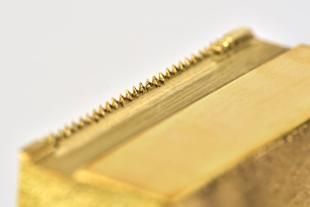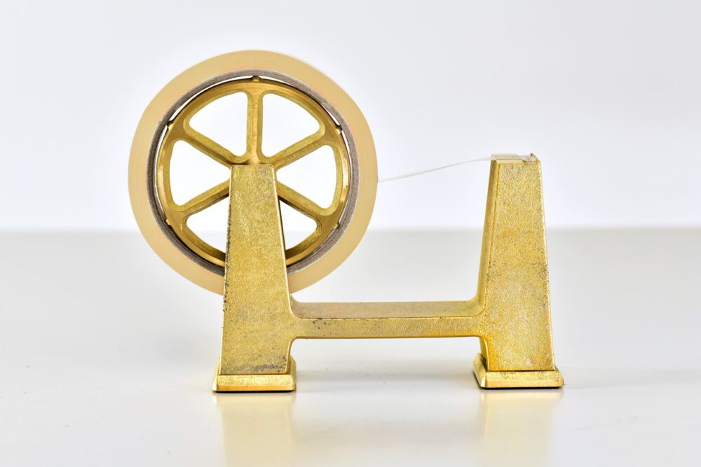 フタガミは富山にある真鍮の鋳物メーカー。このテープカッターも鋳物でできておりずっしりと重く、テープを勢いよく引っ張っても動くことがない(重量は、テープカッターにとって重要なポイント)。ざらっとした質感と鈍いゴールドの色味が渋みを帯び、年月が経てば、きっとエイジングも見られることだろう。