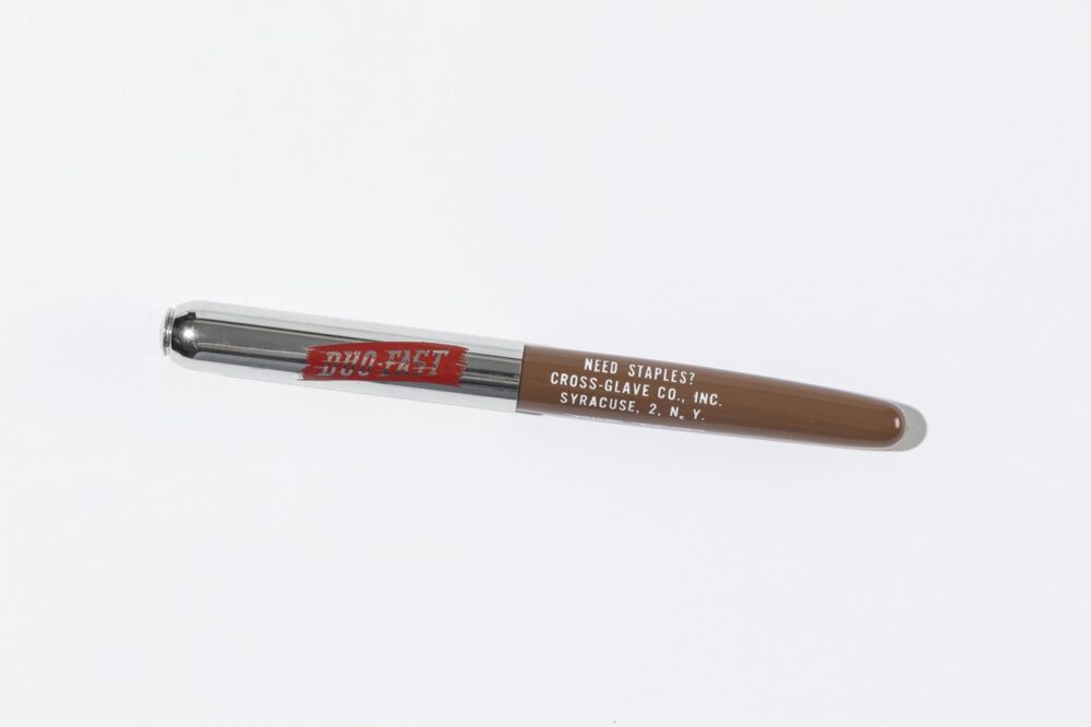 っで、最後の最後に出会ってしまったのだ。ガラスのショーケースに展示されていた’70〜’80年代のものと思われるポケットステープラーに。ペン型のフォルムに、小さなドライバ(針が出るところ)。針自体も小さくてなんともかわいらしい。使うか使わないかは関係ない。これは買っちゃうよ! だって可愛いんだもん。