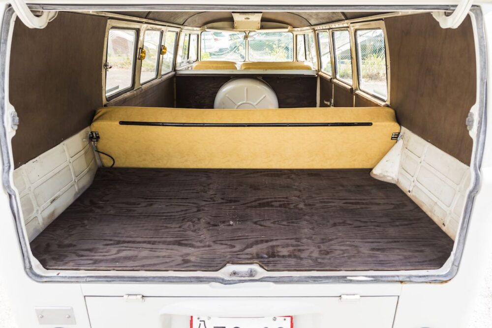 ウエストファリアの内装を取り払い、フロアを板でヘリンボーン柄に仕上げた室内後部。両サイドとルーフも板材を貼る。木の匂いがする室内だ。