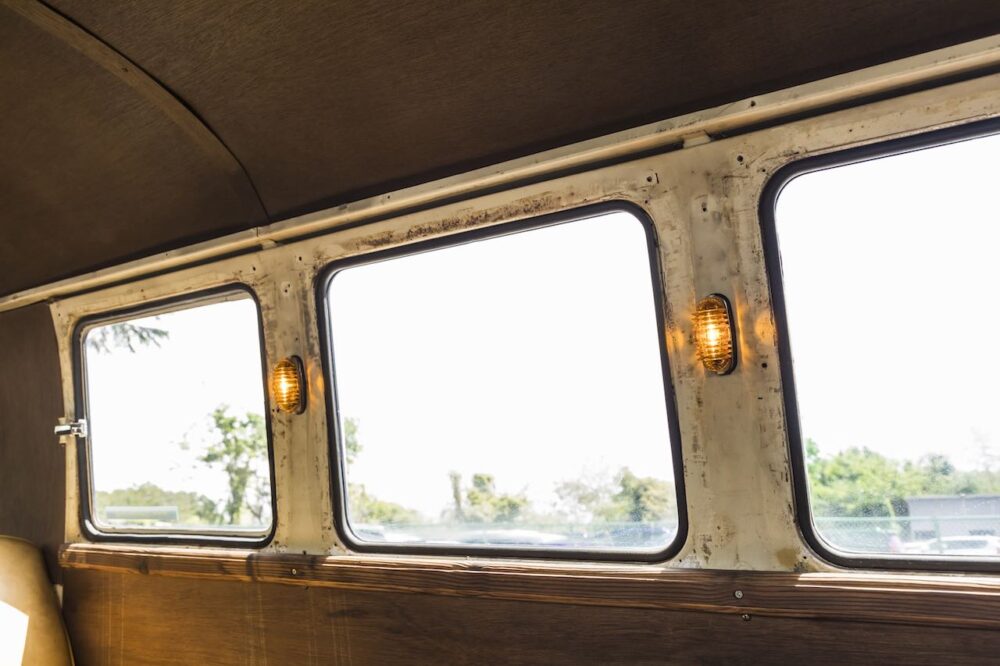 ’75年製ビートルのウインカーを流用した室内灯。温かみのある優しい光が夜の車中泊を盛り上げる。海外では定番のカスタムだとか。