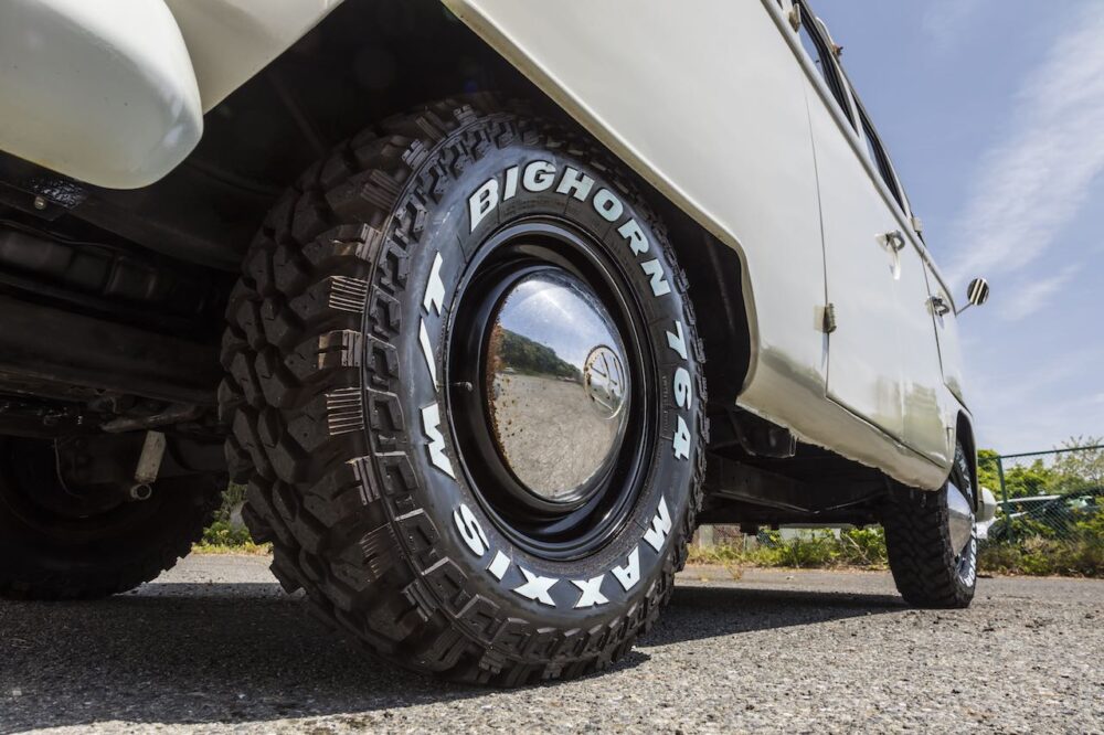 最大の特徴がマキシスのブロックタイヤ。ノーマル車高だが、肉厚でハイトの高いタイヤなのでリフトアップしているように見える。