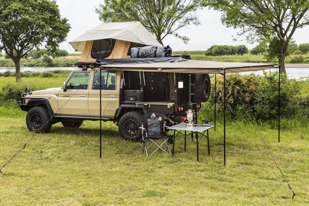 車体左後部に270度展開できるRHINO製バットウイングオーニングをキャノピー上に装着することで、タープを張る必要なしに快適な空間を確保できる。ルーフトップテントは車体右側に展開するようにセット。昇降用の専用ラダーを使って車体右側からアクセスする仕組み。クルマさえ停められれば、泥濘地でも快適に就寝可能だ。