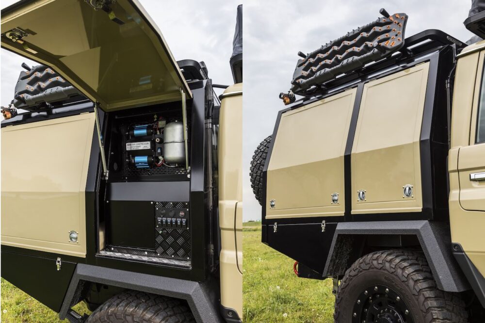 キャノピーは側面のハッチを開けることで内部にアクセス可能。 右側面には作業灯などの電装系の操作スイッチをまとめてあるほか、本格的オフローディング時のタイヤの空気圧 調整や、SUPや浮き輪といったインフレータブル物を膨らませるのにも便利なエアコンプレッサーを装備している。