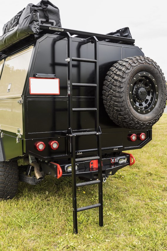 リアには折りたたみ式のラダーとスペアタイヤを装備。ラダーは荷物をルーフ上に乗せる ために登ることが多いため、必需品だという。