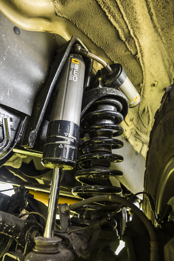 足回りはARBオールドマンエミューのサスペンションキットで前後共に50mmのリフトア ップを実現すると共に足回りを強化している。