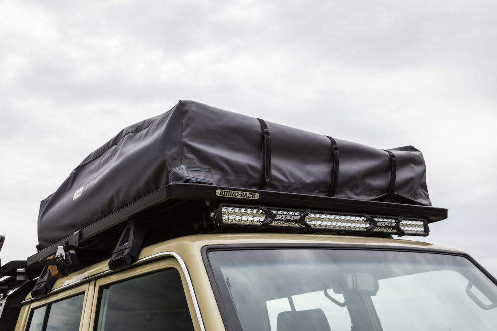 ルーフにはRhino RackのルーフラックにARBのルーフトップテントを装着。前面にはIPFの LEDバーライトを装着している。
