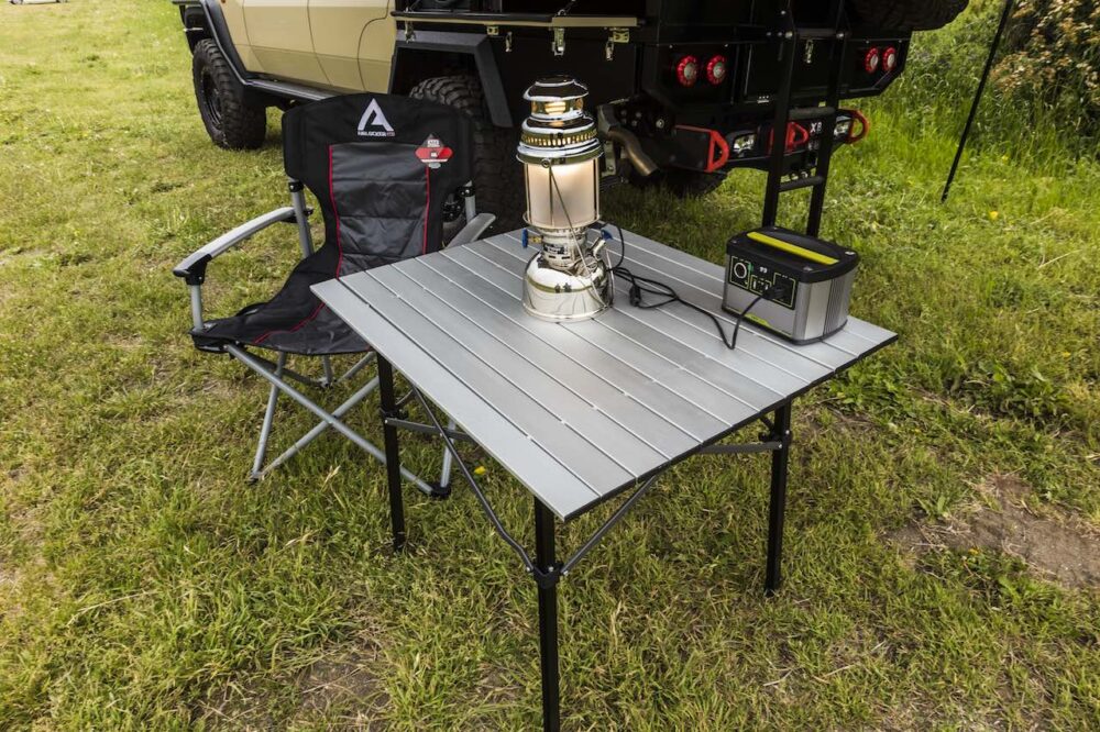 テーブルやチェアだけでなくアウトドアグッズはほとんどキャノピー内に収納可能。フレックスドリームでは写真のペトロマックスのランタンやダルトンといったアウトドアグッズや雑貨も取り扱っている。