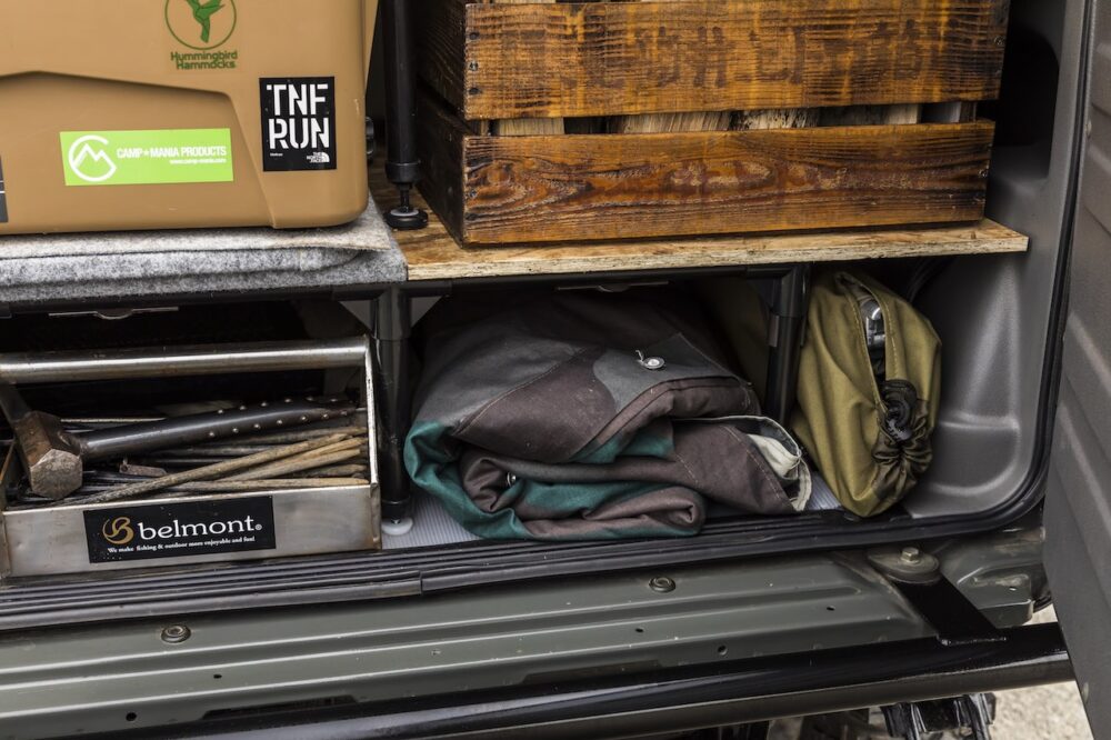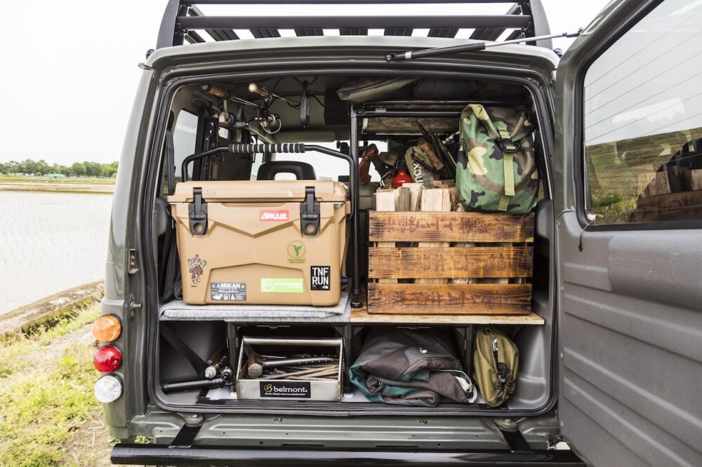 リアゲートを開けると趣味のキャンプ用具と釣り道具が満載! ジムニーの限られたスペースを活かすため、各アイテムは厳選したものを積んでいる。オトコの趣味部屋とでもいうべき車内空間だ。