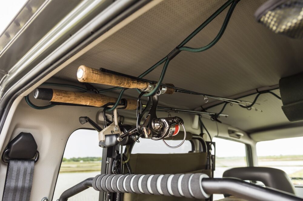 ルーフにはトラウトフィッシング用のロッドを収納している。今年の夏はサーフでヒラメ釣りの予定。全方位アソビグッズで武装中!
