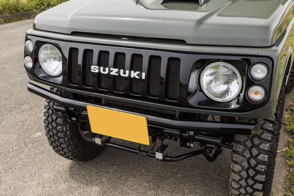 オリジナルバンパーを装着した精悍なフロント周り。ウインカーをクリア仕様にしているのもセンスよし! SUZUKIのロゴマークはオーナーのこだわりで装着している。