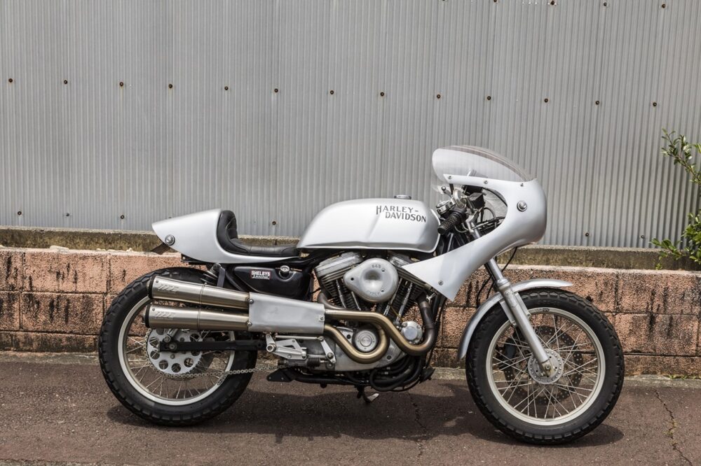 1990年製のスポーツスターをカフェレーサー化! もちろんパーツの多くはワンオフによるもので、ウワサではパーツ代だけで200万円オーバーだとか? ダートトラッカー風のサイド2本出しのマフラーはスーパートラップ製で、弾けるサウンドが耳に心地よい。定番のSRのカフェレーサー仕様とは一味違う、Vツインエンジンのカフェに乗りたい人にもオススメだ。