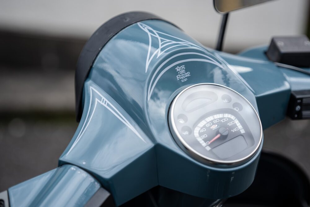 高年式ながらも2ストエンジン、ハンドチェンジという昔ながらのVESPAらしさを残すPX150 EURO3。エンジンは排気量177ccにボアアップしているため、東京の走りでは十分なパワーを発揮。ホワイトボディに爽やかなブルーのピンストライプが映える。