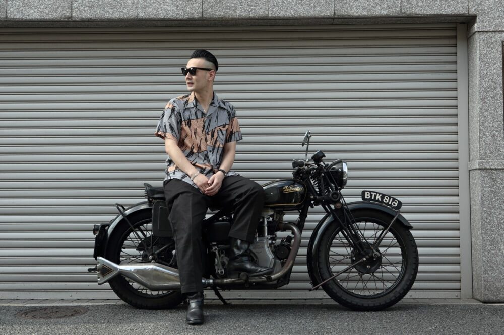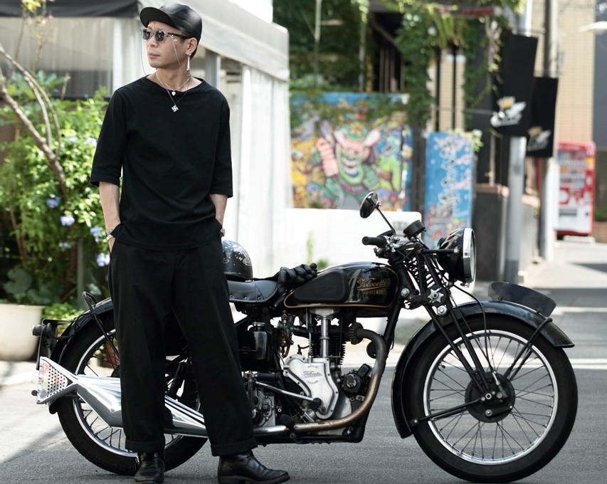 ファッションやモーターサイクルカルチャーなど、1950年代のアメリカ音楽を自身のルーツとする西崎さん。当時のスターたちが、揚々と跨っていたバイクに憧れ、10年ほど前に手にした英国の名車として語り継がれているヴェロセット。そのほかトライアンフ、ヴィンセントなども所有している。