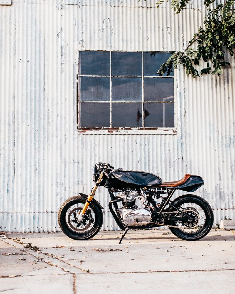 ‘78年のトライアンフT100エンジンをチューンし、C&Jのオーダーフレームに搭載したレーシーなスタイル。オーリンズの正立フォークやモトサロンのモノサスなど、足周りのセッティングも抜かりなし。無駄のない造形の美しさに加え、ストイックにスピードを追求する1台だ。