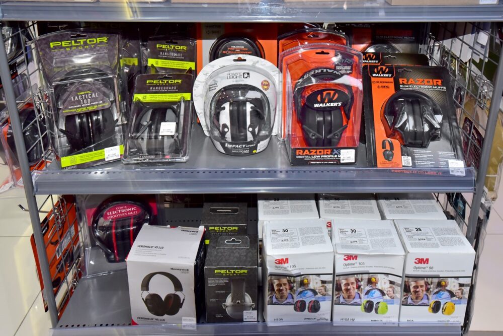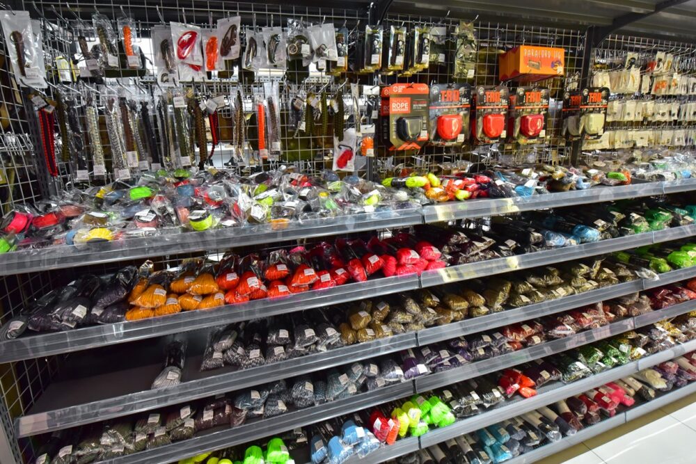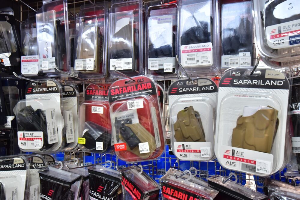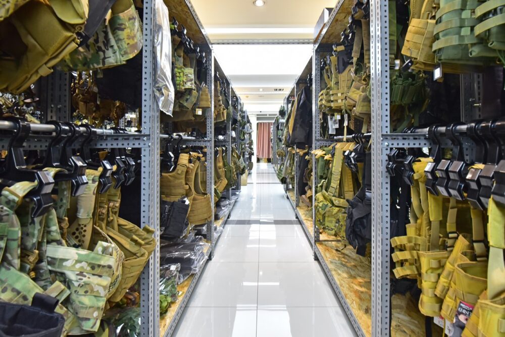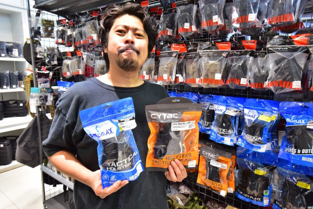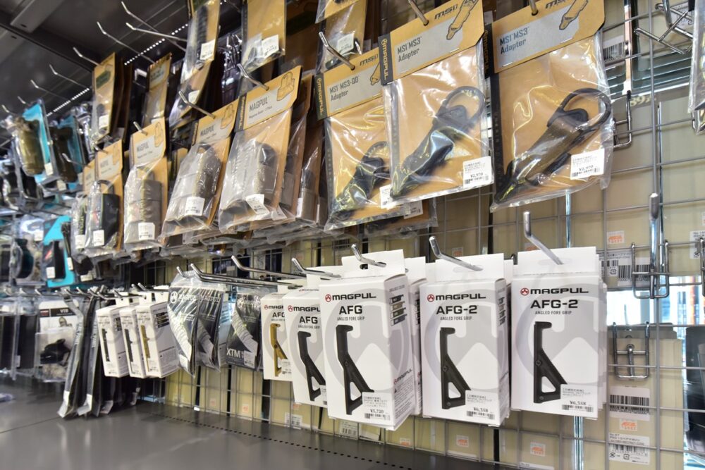 そして圧倒されるのはその商品の物量。パラコードひとつとっても長さやカラーなど選びきれないほどの種類が整然と並べられている。定番のミリタリーやサバゲー関係、実銃系のストックやホルダー、ナイフ、キャップといったアパレル関係も充実し、見ごたえ十分。