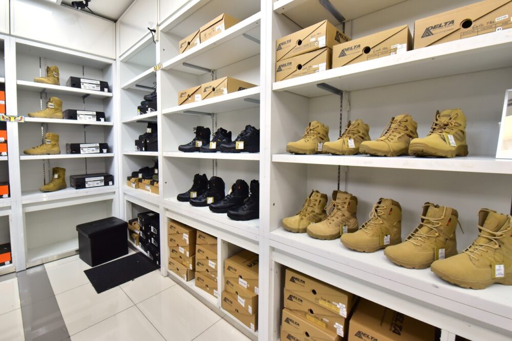 お店の奥はオシャレなブーツ売り場。5.11やデルタ、アンダーアーマーなどがほぼフルサイズで展示。試着できるのがうれしい!