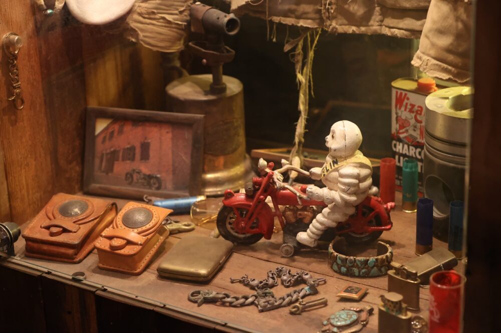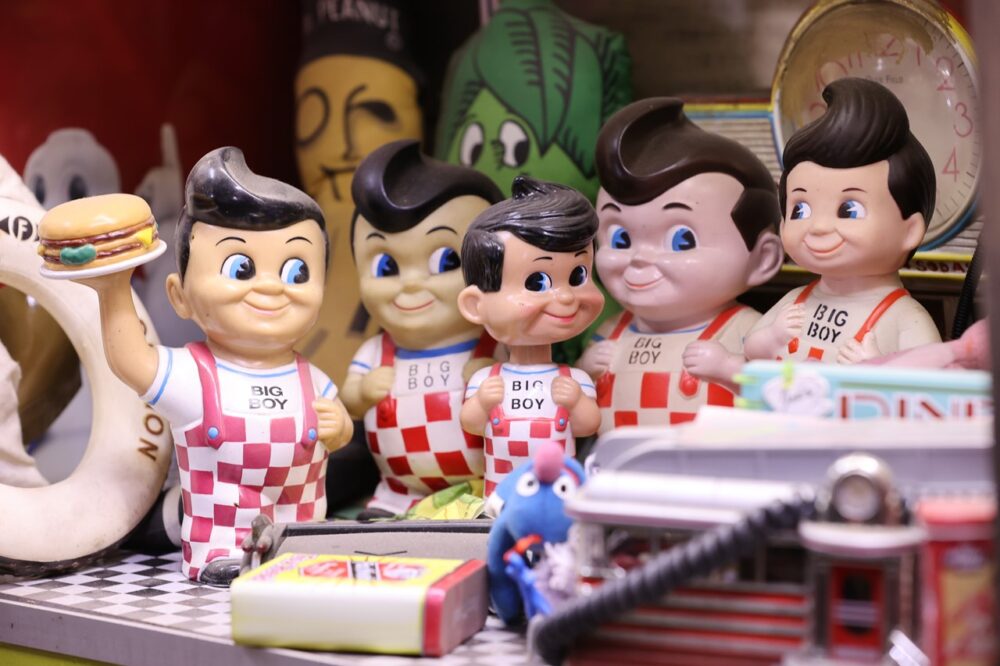 ファミリーレストランBig BoyやタイヤメーカーのキャラクターFiskTire Boyのフィギアなど、海外の企業グッズも収集。コーナー分けしてディスプレイしている。
