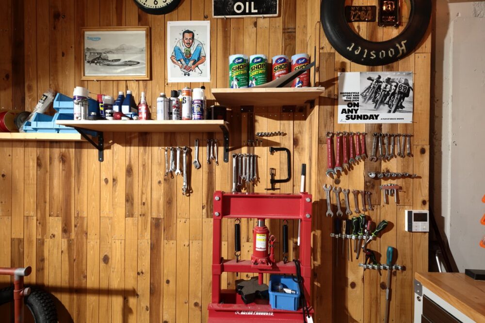 アトリエの一角には、壁をうまく使い、ツール類が収納されている。見た目もよいし、探す手間がないので、実用的なのだ。