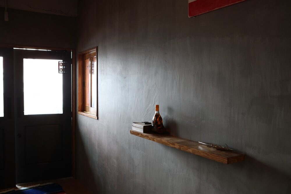 スタンディングでもコーヒーが飲めるように小振りなカウンターを設置。これも中嶋さんが手掛けたもの。ムラ感のあるモルタル壁もいい感じ。