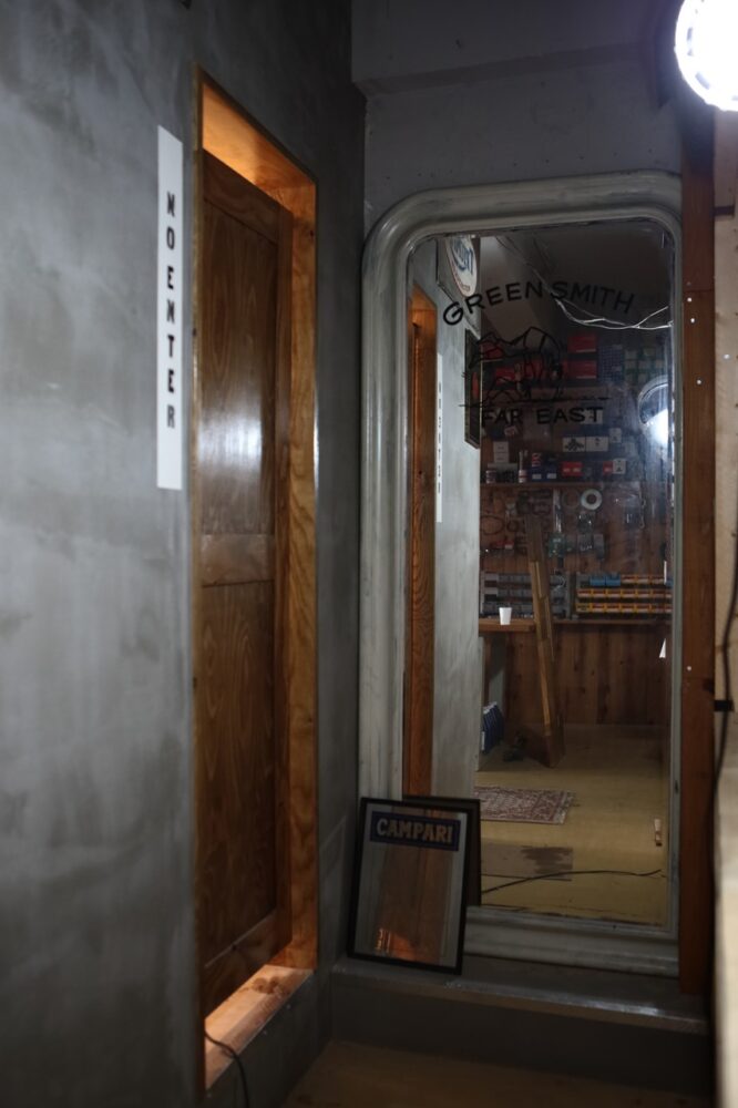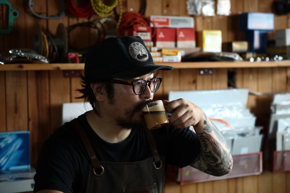 「もともとはラーメン店だった場所を、元アンフィニッシュで現在はHITSCOの名義で内装を手掛ける中嶋さんに依頼しました。カフェとファサードは中嶋さん、奥の工房スペースなどは自身でDIYしています。壁をうまく使って、パーツをディスプレイしたかったので、什器はあえて置かないようにしています。鉄のパーツがメインなので、随所にプライウッドを使っているのもポイントですね。前の店舗は工場にして、ここはコーヒーを飲みながらバイクの話をする場所にしたいんです」