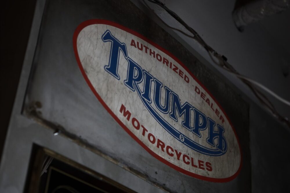ヴィンテージのトライアンフの看板をディスプレイ。アメリカだけでなく、本場イギリスにも何度も渡り、現地の空気感を深く理解している。