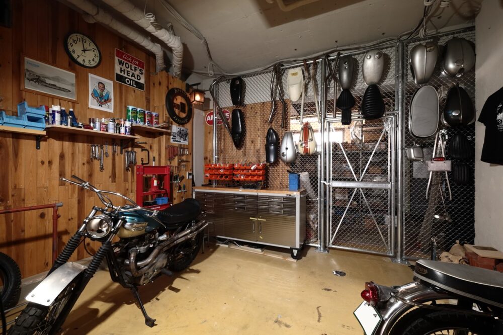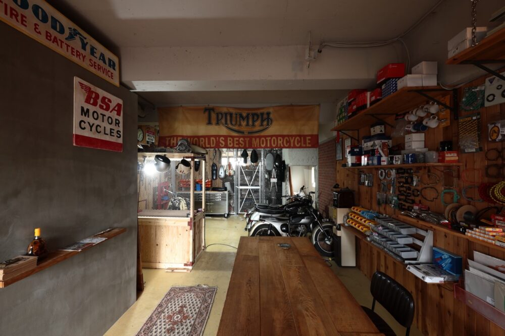 奥にある作業スペースには、整備などで預かっているトライアンフが。ここでは今後、講習会も行う予定。金網のフェンスをディスプレイに活用。